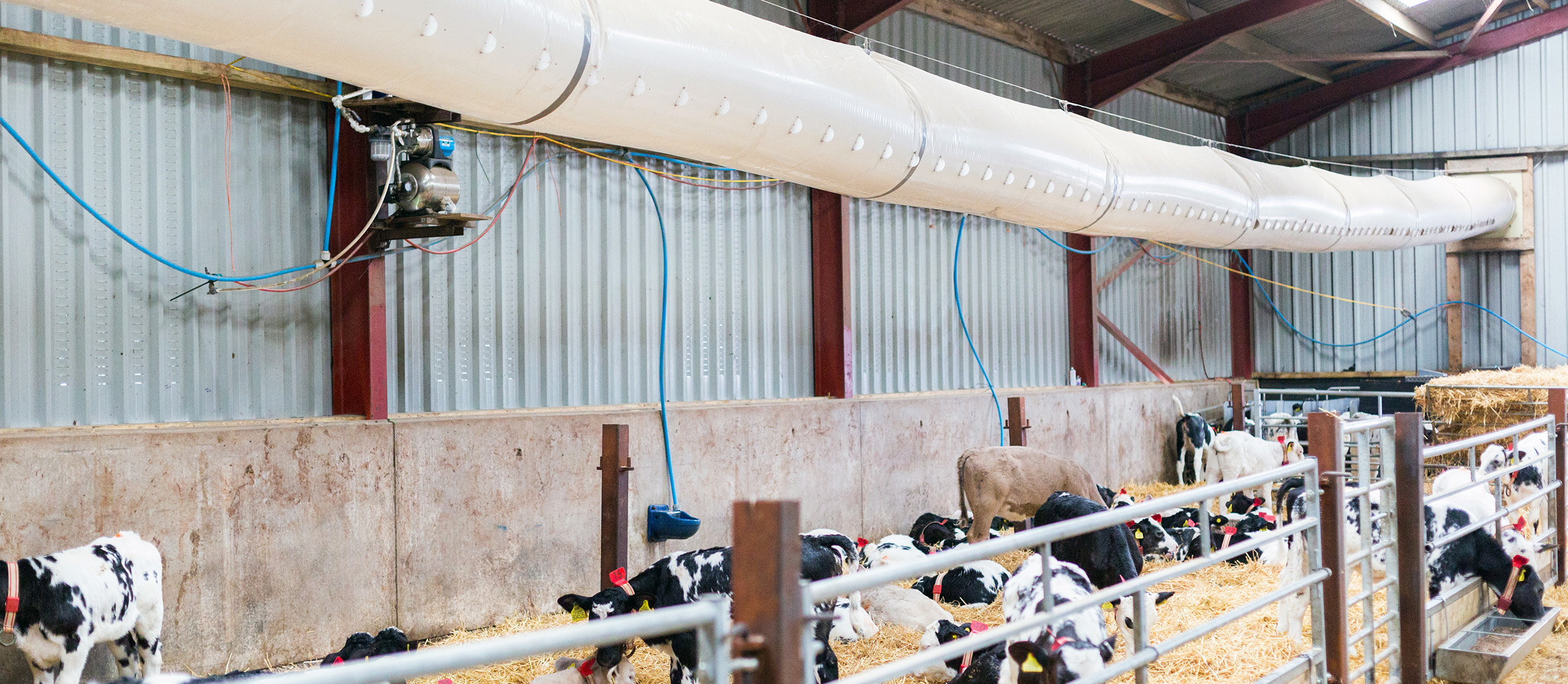 A Positive Pressure Tube Ventilation System (PPTS), often referred to as tube ventilation, is a custom-designed solution for livestock buildings such as calf sheds and dairy housing. Fresh air is pushed into a tube, which is suspended from a catenary wire and distributes air evenly through precision-cut outlets along its length.